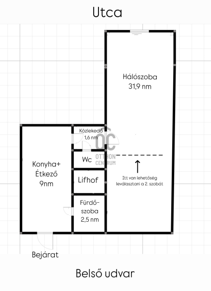 Az ingatlan alapterülete 46 négyzetméter, tágas, 31,9 nm-es szobával, melyből könnyen leválasztható egy második szoba, hiszen korábban is így volt elosztva.