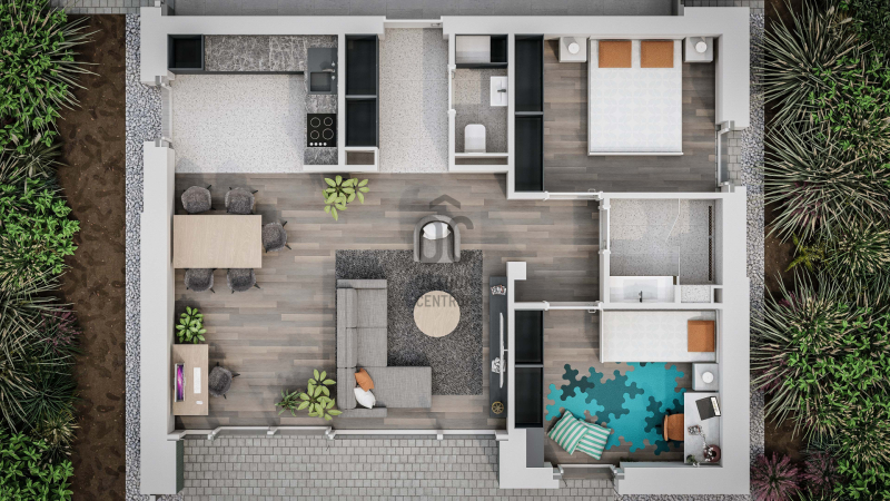 Földszinti, N+2 szobás, 66,87 m2-es lakás, +10,4 m2-es terasszal + 70 m2 kertkapcsolattal:- amerikai konyhás nappali (32 m2)