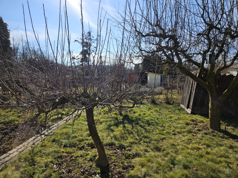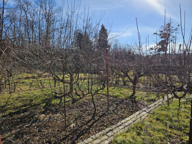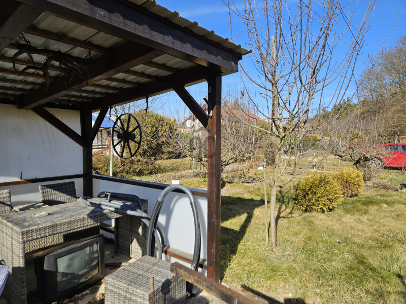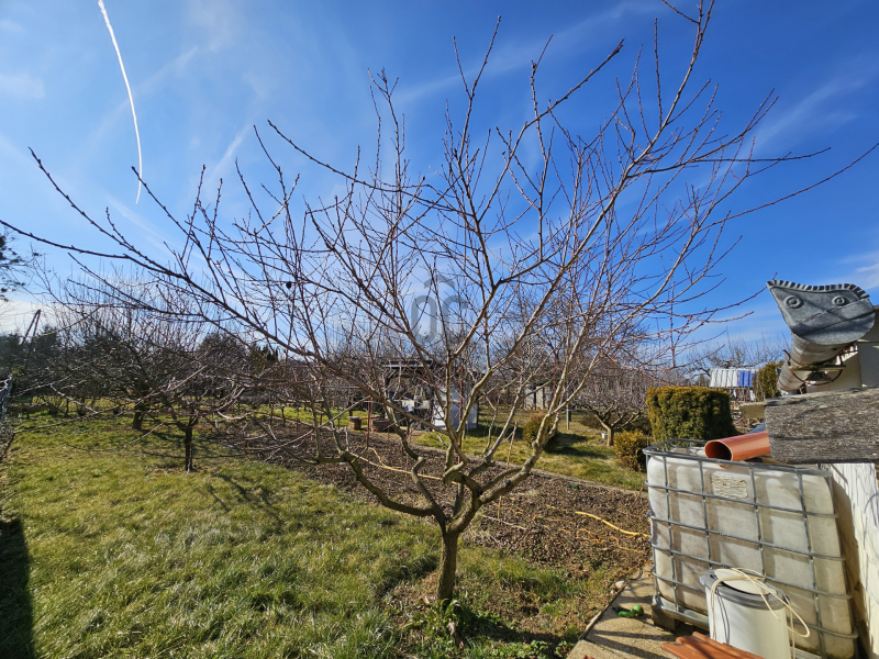 A telek körbe kerített, gyümölcsfák, ribizli, szőlő gazdagítják.