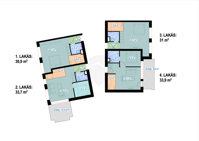 2. lakás 33,7m2 + 10,4 m2 erkély