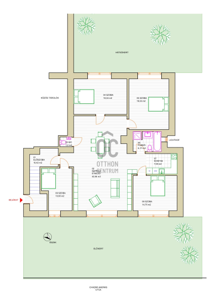 Nagyon jó beosztású, négy önálló szobája nyílik a nappaliból, amely az étkező és társalgó szerepét tölti be. Kül
