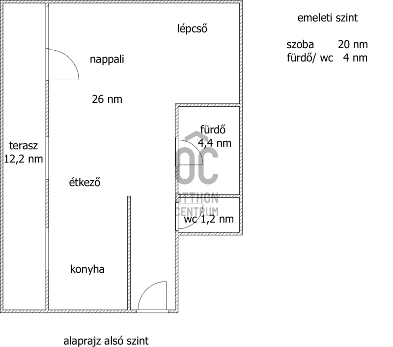 - 1. szint: 25 nm konyha - étkező - nappali, 4,4 nm fürdő, 1,2 nm - wc