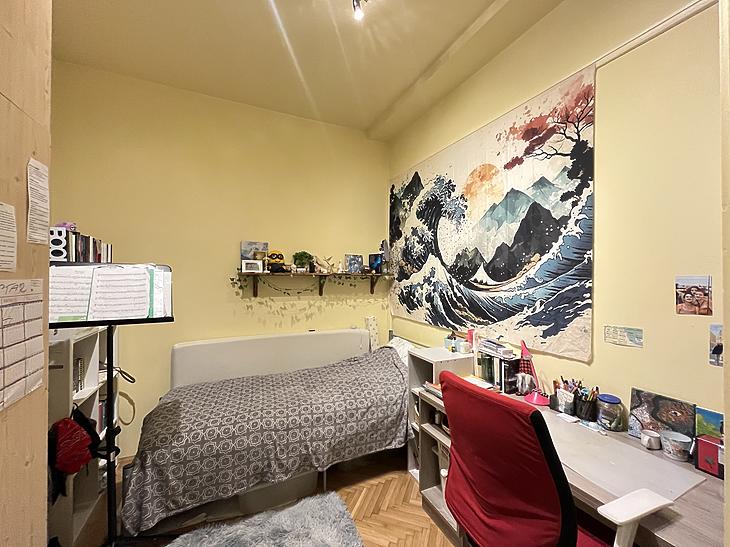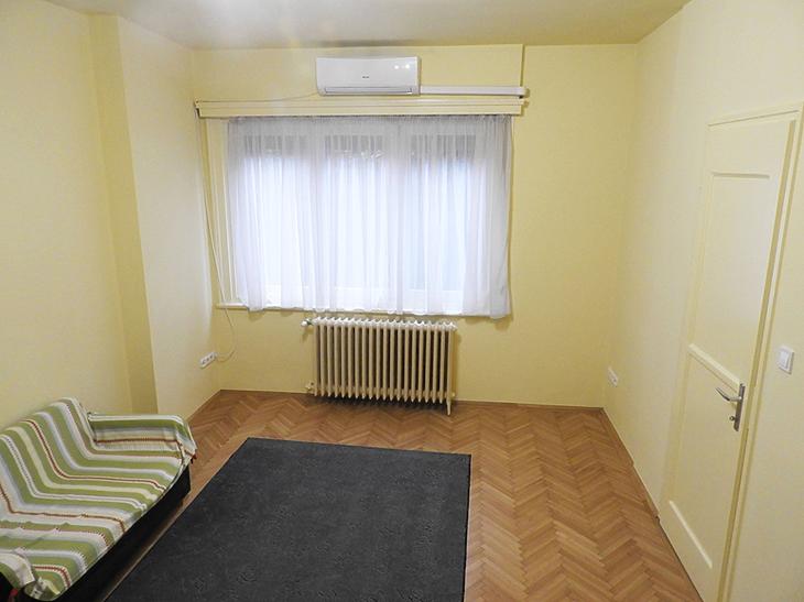 A szoba faparkettás, a vizeshelyiségek pedig járólaposak.