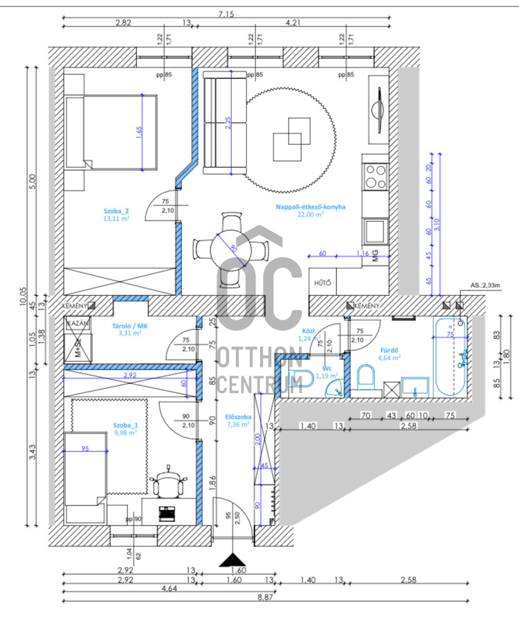 62 nm, 3 szoba (nappali + 2 háló)
