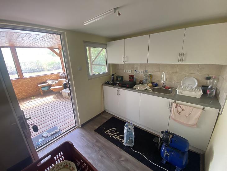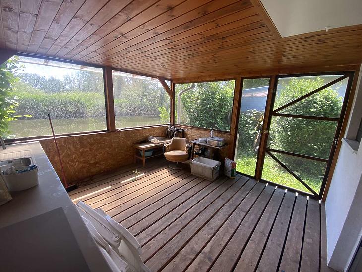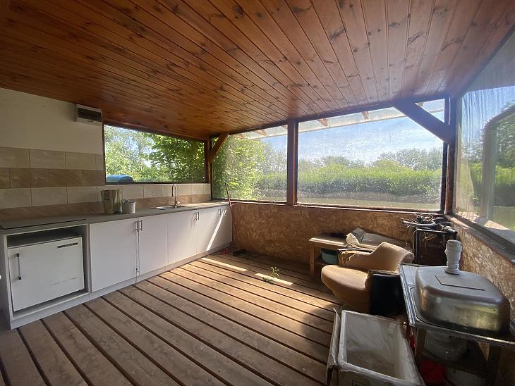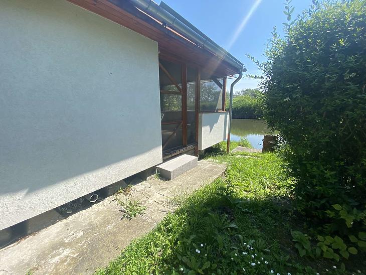A fedett terasz a tó felé néz, a ház előtt autóbeállásra 1 kocsival van lehetőség.