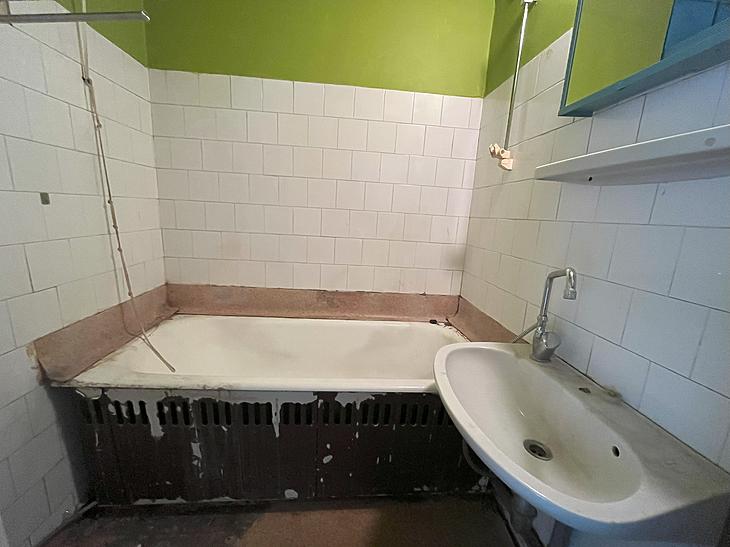 A fürdőszoba az eredeti állapotában van, régi burkolattal és vaskáddal.